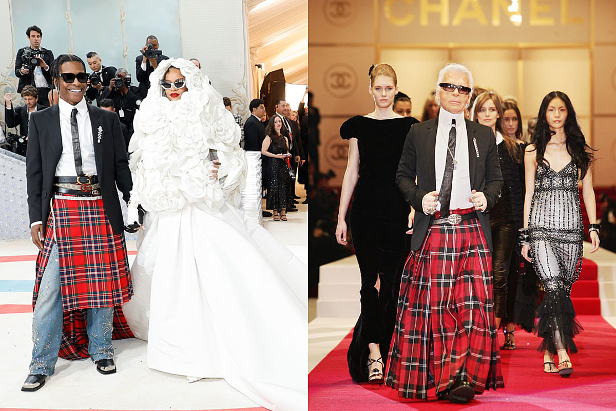 On Monday evening (May 1), following A$AP Rocky pushing through a crowd of people and using a woman’s face to climb over a barricade ahead of appearing on the most coveted fashion red carpet, Rocky and his lady Rihanna graced the event with the Harlem rapper paying homage to the late fashion icon Karl Lagerfeld. Similar to Lagerfeld’s Chanel look for the 2005 spring/summer pret-a-porter collection worn in a Tokyo fashion show in December of 2004, Rocky wore a black blazer with a white shirt and tie, a red plaid skirt over bedazzled denim jeans, with three Gucci belts and black silver-toe boots.